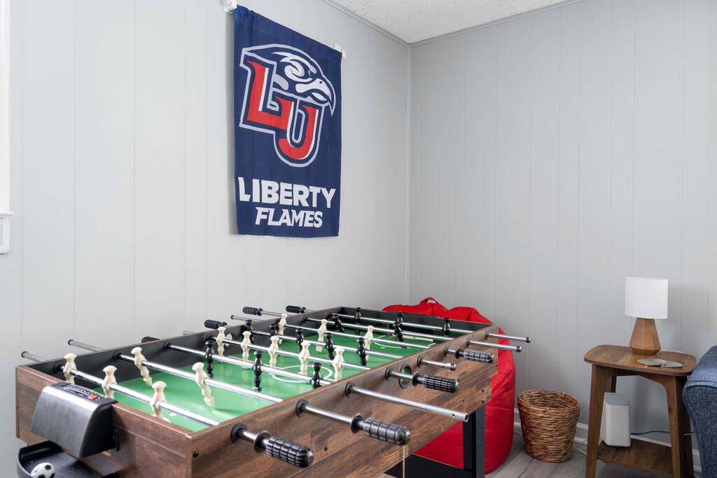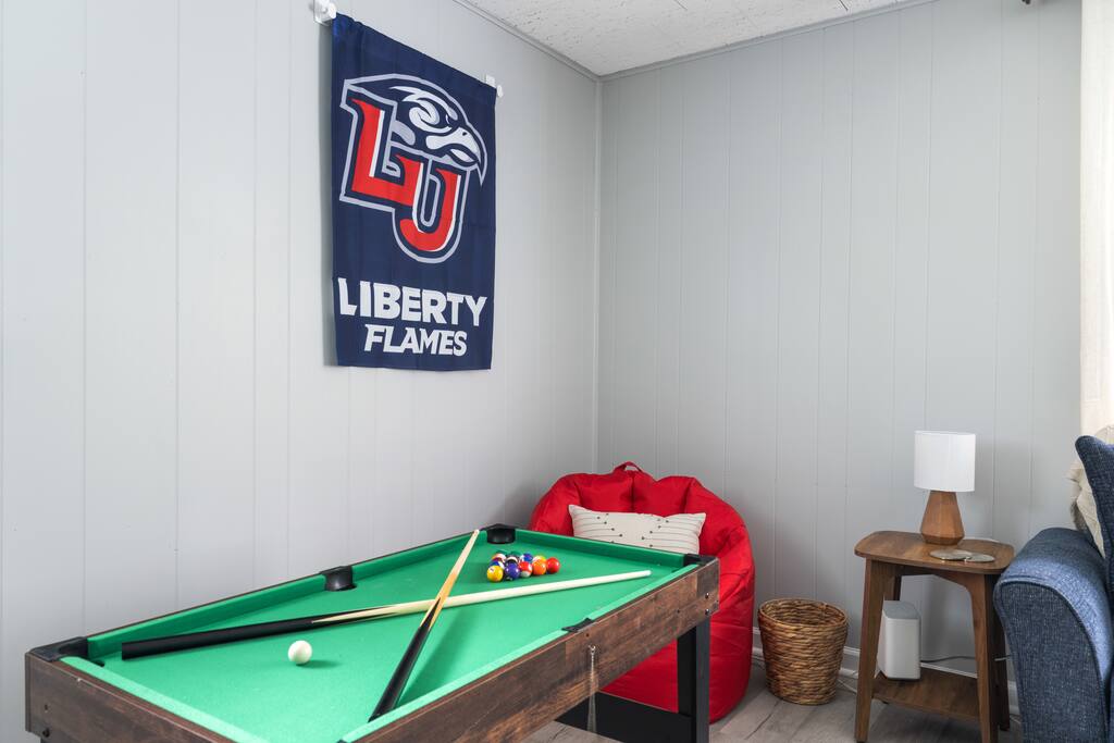 Welcome to Liberty Lodge – Your Home Base in Lynchburg Whether you’re here for Liberty, visiting family, or just out to make memories—you’ll find the perfect spot to kick back and enjoy it all. Why You’ll Love Liberty Lodge: - 4 mins to Liberty University - Walkable to Target and Ward’s Crossing - Game room with a Ping pong table, indoor basketball arcade and a dartboard - Two Roku Smart TV lounges (with a multi-game table + board games + books) - Backyard fire pit with string lights + Liberty-themed corn hole - Expandable Dining Table (Up to 8 chairs) - Sleeps 12 across 4 stylish bedrooms - Plush memory foam mattresses + blackout curtains in every room - Charging stations in every bedroom - Shampoo, conditioner, and body wash provided - Kid-friendly: pack-and-play, high chair, kid dishes, baby tub - Keurig Coffee Machine + Drip Coffee (Coffee on the house!) - Fully equipped kitchen + Outdoor dinnerware - Smart lock, high-speed Xfinity Wi-Fi, - Washer/Dryer We've thought of everything, so you don't have to! 🛏️ Sleeping Setup - Bedroom 1: King bed - Bedroom 2: Queen bed - Bedroom 3: 2 Full beds + twin pull-out trundle - Bedroom 4: Twin-over-full bunk bed ~ Pack and Play for your little one All bedrooms include plush memory foam mattresses, hotel-grade pillows, blackout curtains, charging stations, soft bedding, extra blankets, dressers, and a calm place to unwind. 🛋️ Main Living Room Relax on leather couches with soft throw blankets and catch the game on the 55″ Roku Smart TV. Flooded with natural light, this space feels fresh, open, and full of good energy. 🎮 Liberty Flames Lounge Your second living space "Go Flames!" —complete with a 65″ Roku TV and a multi-use game table (mini foosball, mini-pool, and chess), board games for a wide range of ages. Great for kids, teens, and group movie nights. 🏓 Garage Game Room - Full-size ping pong - Indoor Basketball arcade - Dartboard 🍳 Kitchen & Dining - Keurig with K-cups + drip coffee station (coffee on the house) - Full cookware, utensils, and kid-friendly dinnerware - High Chair for the little ones - Expandable dining table for 8 - Full-size BBQ grill (outside) - Outdoor plates for fire pit s’mores & snacks Whether it’s a big breakfast before campus tours or pizza after a long hike, the kitchen’s got everything you need. 🛁 Bathrooms (3 Total) - Shower/tub combos - Shampoo, conditioner, and body wash provided - Soft, hotel-quality towels (dedicated makeup towels) - Hair dryer + storage for your essentials 🌲 Backyard Fire Pit Area When the sun sets, the magic starts. - Fire pit with red & blue Adirondack chairs - Warm white string lights overhead - Outdoor dinnerware for easy snacks - Large grassy yard for play, coffee, or quiet conversation - Liberty Flames themed corn hole 🛜 Tech, Comfort & Access - Smart lock for easy self check-in - Xfinity high-speed Wi-Fi - Minut noise sensor for peaceful stays - Central heat, A/C, and fans - Washer and dryer (with detergent) - Parking for 2–4 cars in driveway + gravel overflow ~ Both levels accessible from ground entry 📍 What’s Nearby - Liberty University – 4 min (1.7 mi) - Target & Ward’s Crossing – 2 min (0.8 mi) - Walmart Supercenter – 6 min - River Ridge Mall – 6 min - Starbucks, Panera, Chick-fil-A – 3–7 min - Aldi – 5 min - Downtown Lynchburg (coffee, art, dining) – 10 min - Snowflex (year-round skiing/tubing) – 10 min - Amazement Square (children’s museum) – 13 min - Sharp Top Mountain / Blue Ridge Parkway – 40 min - Hospitals (General & VA Baptist) – 15–20 min 🕒 Year-Round Comfort Spring & Summer: lawn games, fire pit evenings, Liberty events Fall: cozy blankets, campus buzz, foliage all around Winter: cocoa nights, movies by the fire, warm hospitality 📏 House Rules No smoking or vaping within 25 feet of the home No parties or unregistered guests No pets—this is an allergy-friendly space Quiet hours: 10pm–8am Guests must be 25+ to book unless traveling with family Follow simple checkout steps listed in the guidebook 🔑 Guest Access - Full access to the home, backyard, game room, and all amenities. - Smart lock with a personalized entry code makes check-in a breeze. 🌟 More Than a Stay. It’s Liberty Lodge. This home is stocked with soft towels, crisp sheets, a cozy coffee bar, and space to gather, play, and rest. Whether it’s your first visit or your fifth—we’ve made Liberty Lodge a place you’ll want to come back to. Dates fill fast around Liberty events and holidays—book your stay now before it’s gone. We’d love to host you.