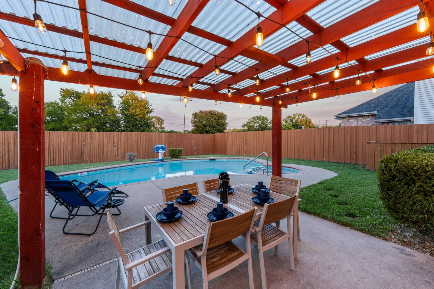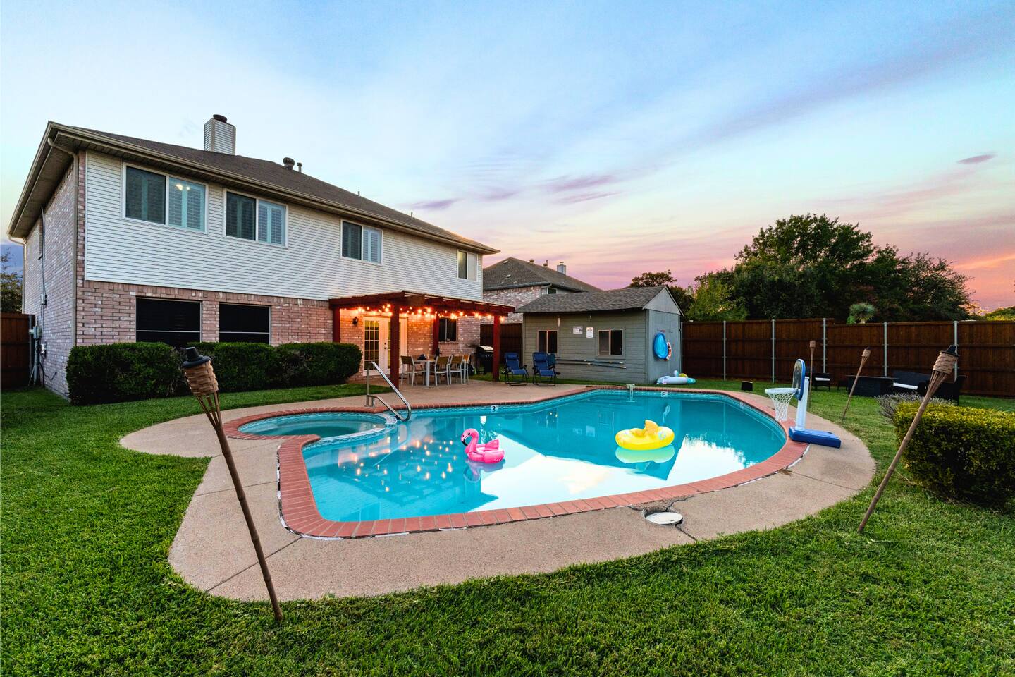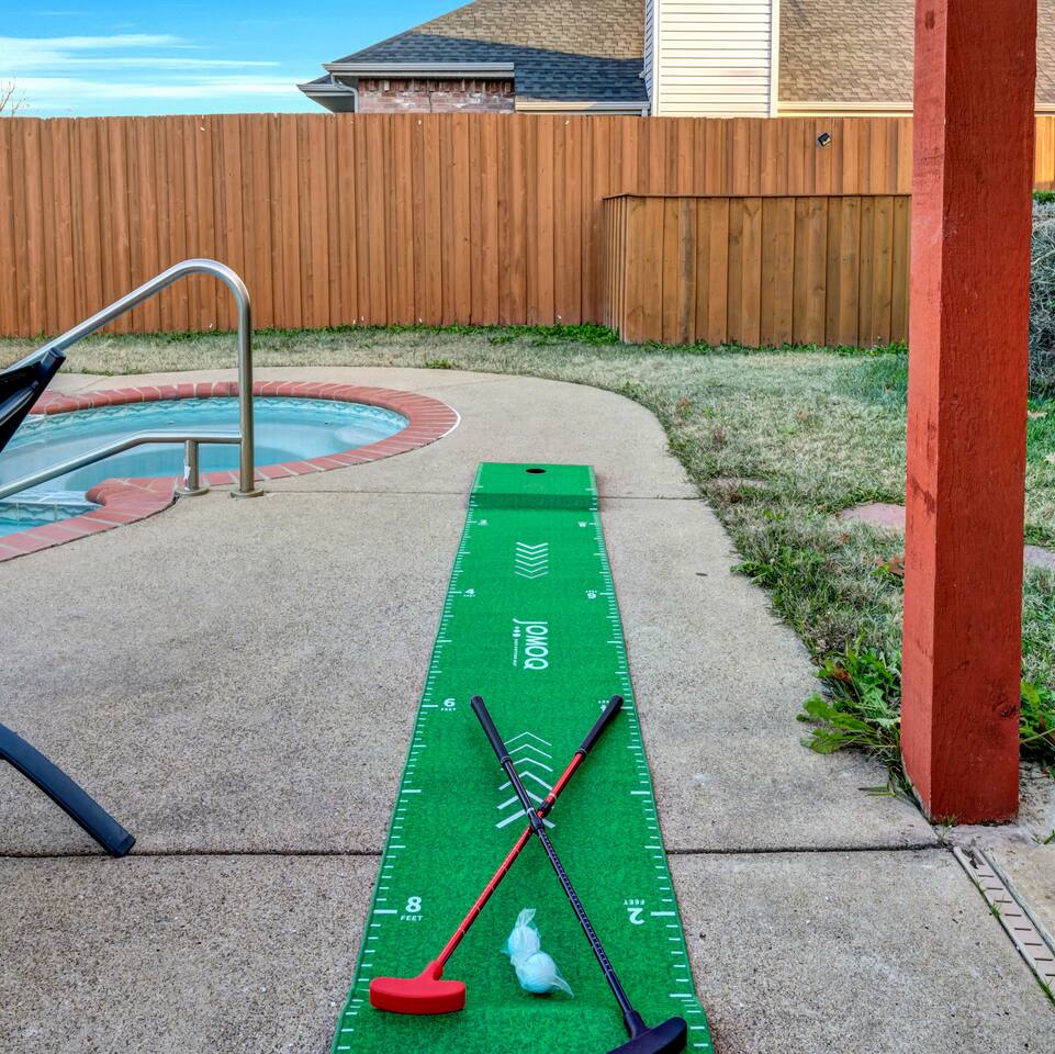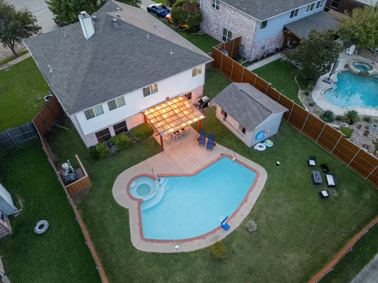 The house has plenty of space for everyone to unwind. With 5 bedrooms, 2.5 baths, and room for up to 12 guests, it’s set up for families and groups who want comfort and fun under one roof. Between the heated pool, hot tub, backyard games, and the garage game room, there’s always something to do. Relax, play, and reconnect! WHY YOU'LL LOVE BLUE HAVENS: 🏊 Heated pool w/ LED basketball + hot tub 🔥 Backyard firepit + outdoor dining & lounge 🎱 Garage game room (pool, darts, cards, LED lighting) ⛳ Bocci ball, spikeball, putting green 🛋 Smart TVs + LIVE TV 🔥 Indoor Fireplace 🛜 High-speed WiFi 🍳 Fully stocked kitchen w/ LED mood lighting + breakfast bar 👶 Crib, high chair + Dinnerware for kids 🐾 Pet-friendly 🖥️ Dedicated Workspace 🛏 Sleeps 12 across 5 bedrooms (see below) 🚗 3-car parking in a quiet neighborhood 🌊 Minutes to Lake Ray Hubbard & 25 min to Downtown Dallas 🛏️ SLEEPING SETUP Master Suite: King bed, luxury bath, crib, Smart TV, large closet Bedroom 2: 1 Queen bed Bedroom 3: 1 Queen bed Bedroom 4 (Main Floor): 1 Queen bed Bedroom 5: Twin-over-twin bunk + 1 Queen bed ~ All bedrooms feature cozy bedding, ample storage, and a calm place to unwind. 🎮 GAME ROOM Full-size pool table Dartboard + card table LED mood lighting Couch seating (convertible bench) 🍳 KITCHEN & DINING Fully stocked with cookware, utensils & kid dinnerware Gas stove + LED mood lighting Keurig Coffee and Drip Coffee Machines (Coffee on the House!) Breakfast bar + dining table for group meals High chair included Propane grill for outdoor feasts 🛁 BATHROOMS (2.5 Total) Master ensuite w/ luxury bath Guest bath w/ shower/tub combo Half bath for convenience Stocked with fresh towels, shampoo, conditioner, body wash and hair dryer 🌲 BACKYARD Heated pool + hot tub LED pool basketball (syncs to music!) Firepit with seating & s’mores setup Putting green, bocci ball & spikeball Outdoor lounge + dining area 🛜 COMFORT & TECH Smart lock for easy self check-in High-speed WiFi & Smart TVs Central A/C + heating Washer & dryer w/ detergent 3-car driveway parking 📍 WHAT'S NEARBY Lake Ray Hubbard – minutes away The Harbor Rockwall – 10 min (dining, shops, lake views) Downtown Dallas – 25 min Dallas Love Field (DAL) – 35 min 📏 HOUSE RULES No parties or unregistered guests No smoking/vaping indoors Quiet hours: 10pm–8am Pets welcome (with approval - Pet Fee applies) 🔑 GUEST ACCESS Guests have full access to the home, backyard, and all amenities. Check in easily with a personalized smart lock code. 🌟 More Than a Stay. It’s Blue Havens. Whether it’s a family reunion, lake trip, or group getaway, we’ve created the perfect space to laugh, play, and make memories. 📅 Dates go quickly—reserve your stay at Blue Havens today!